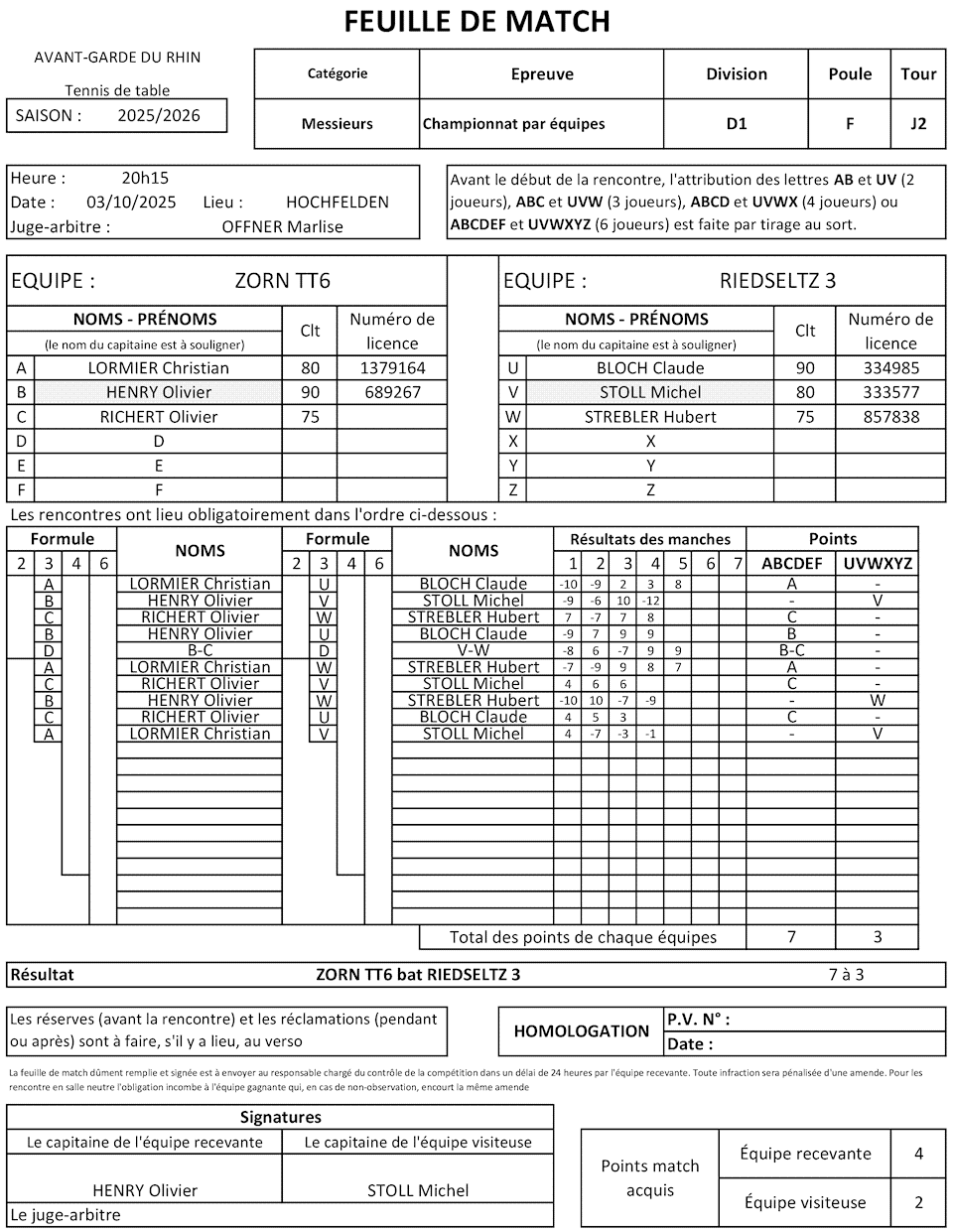 Avec l’absence de Thierry VALENTIN, Zorn TT alignait pour cette soirée Olivier RICHERT (75), Christian LORMIER (80) et son capitaine Olivier HENRY (90). Concernant Riedseltz 3, c’est l’équipe type qui s’est présentée avec un joueur classé 75, un 80 et un 90, soit un niveau équivalent à l’équipe locale.