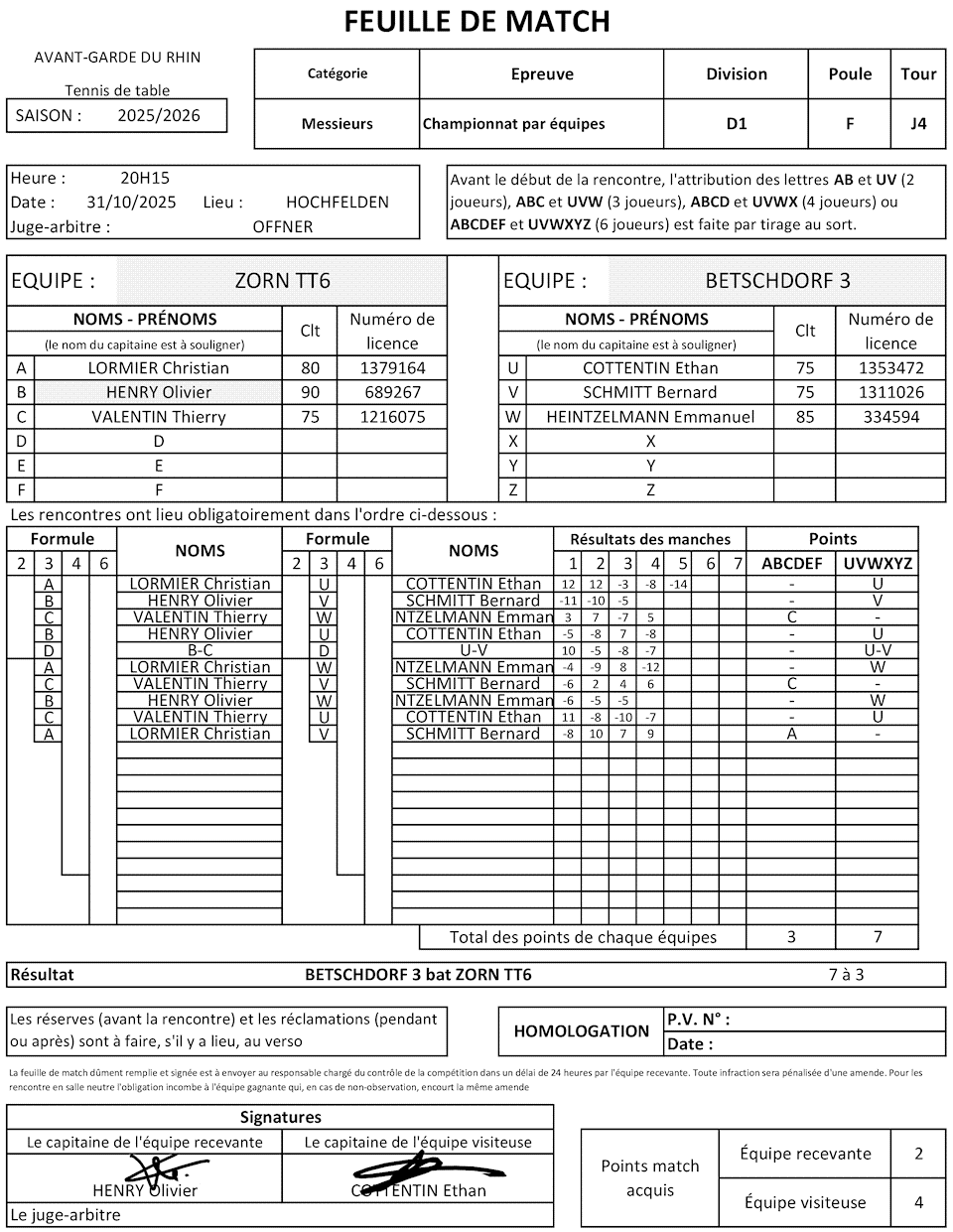 Soirée difficile pour Zorn TT 6 qui s’est inclinée 3-7 face à une équipe plus forte et qui a bien négocié la rencontre. L’équipe 6 sauve néanmoins de justesse le point du bonus.